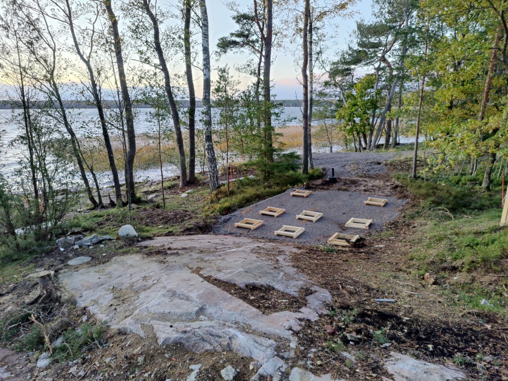 Projektiamme seuranneet jo tietävätkin, että rantarakennelmamme koostuu kolmesta osasta: saunasta, tuvasta sekä niiden väliin tulevasta terassista. Alla olevassa kuvassa näkyvät laatikot ovat saunan perustusten anturoita varten. Tupa tulee kuvan etualan kalliokohouman päälle. Tässä vaiheessa päätimme vielä siirtää koko systeemiä reilun metrin takana näkyvää tieluiskaa kohti. Tärkeimpänä syynä oli, että saimme paremman ja avoimemman näkymän ylhäältä huvilalta merelle. Lisäbonuksena perustusten korkoerot myös vähän pienenivät.