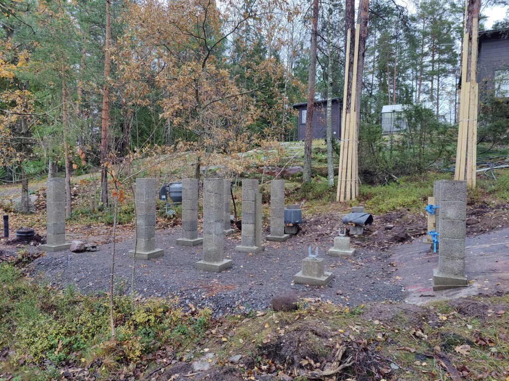 Kuvassa alla on vasemmalla saunan pilarit ja oikealla kallion päällä olevat tolpat ovat tulevaa tupaa varten. Väliin jää terassi, jonka reunimmaiset 48×148 tukipuut kiinnityvät harkkopilareihin. Terassin keskelle tulee yksi poikkipalkki kestopuutolppien varaan. Tolpat tulevat kuvassa näkyviin pilarikenkiin.