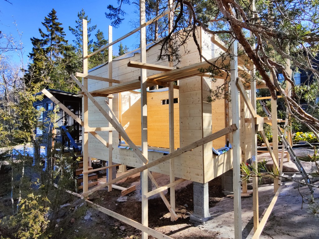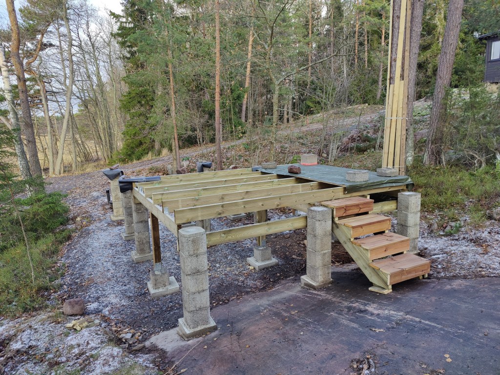 Sauna tulee kohteeseen siis ensin ja se asennetaan näiden metristen tolppien päälle. Haluamme sen myös käyttöön niin pian kuin kuin mahdollista, joten käynti sinne pitää jotenkin järjestää. Tätä varten teimme väliterassille rungon (kuvassa alla) ja sen päälle tulee valiaikaiseksi kulkutasoksi 12 millin vanerit. Kansilaudat asennetaan vasta, kun näemme, miten ja mihin rakennusten hirsiseinät tarkkaan ottaen perustusten päälle asemoituvat.