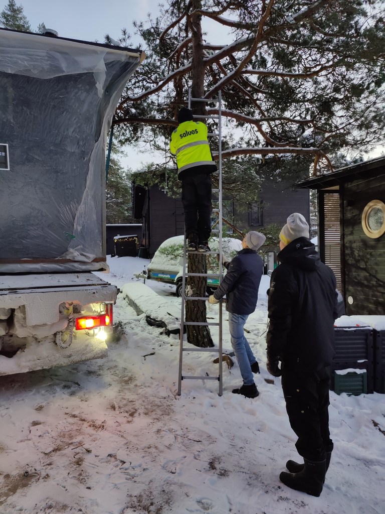 Joulukuun alussa vuonna 2023 oli jo pakkaskelit jopa täällä Länsi-Uudenmaan rannikkolla. Onneksi lunta ei ollut kuin nimeksi. Toimitus tuli tasan ajallaan ja ainakin tähän asti Salvos on muutenkin hoitanut lupaamansa asiat mallikkaasti. Tällaisten valmismökien toimittamiseen liittyy joitain rajoituksia mm. rakennusten mittojen osalta. Hyvin he kuitenkin jumppasivat meidän toiveiden ja vaatimusten kanssa, jotta sopivat kompromissit saatiin aikaiseksi. Joissain asioissa, kuten esim. lauteiden osalta, emme löytäneet Salvoksen valikoimista meille sopivaa ratkaisua joten jätimme ne pois tilauksesta. Toivottavasti myös saunatuvan toimitus sujuu yhtä mallikkaasti. En toisaalta näe syitä miksei – kyseessähän on yksinkertaisempi asia eli pelkkä materiaalitoimitus. Tässä vaiheessa ainakin voimme lämpimästi suositella Salvosta tällaisiin projekteihin!Ajoväylä alas rantaan tekee kaksi tiukkaa 90 asteen mutkaa. Tavalliset kuorma-autot ovat niistä selvinneet ilman erikoisempaa kikkailua, mutta tämä korkea ja leveä kuljetus vaati parin oksantyngän poistoa mutkassa olevasta männystä.