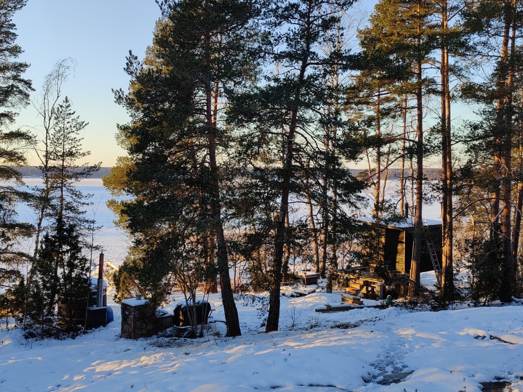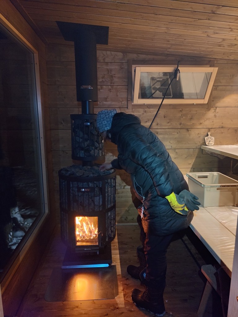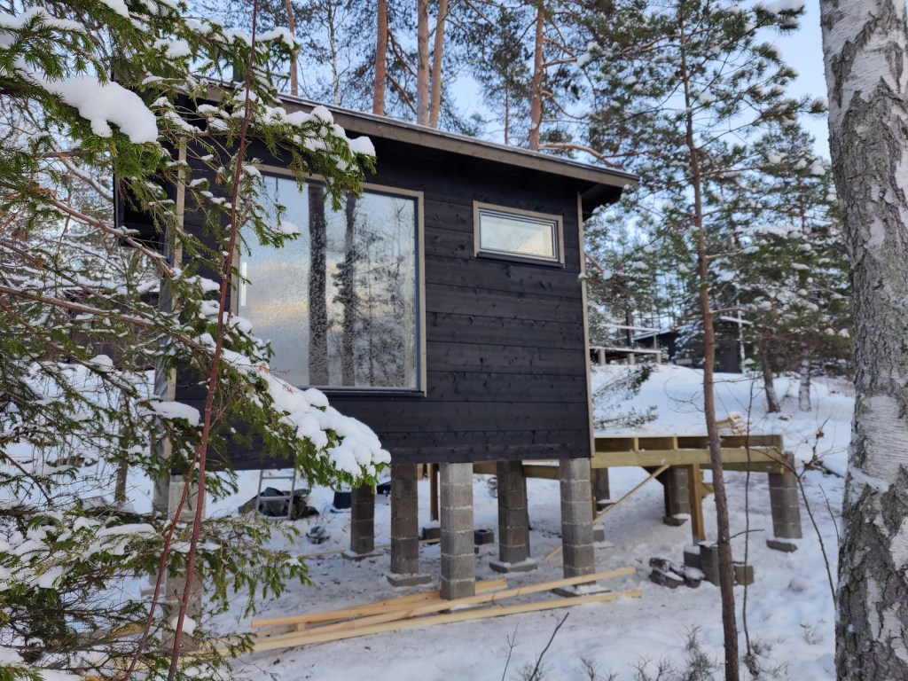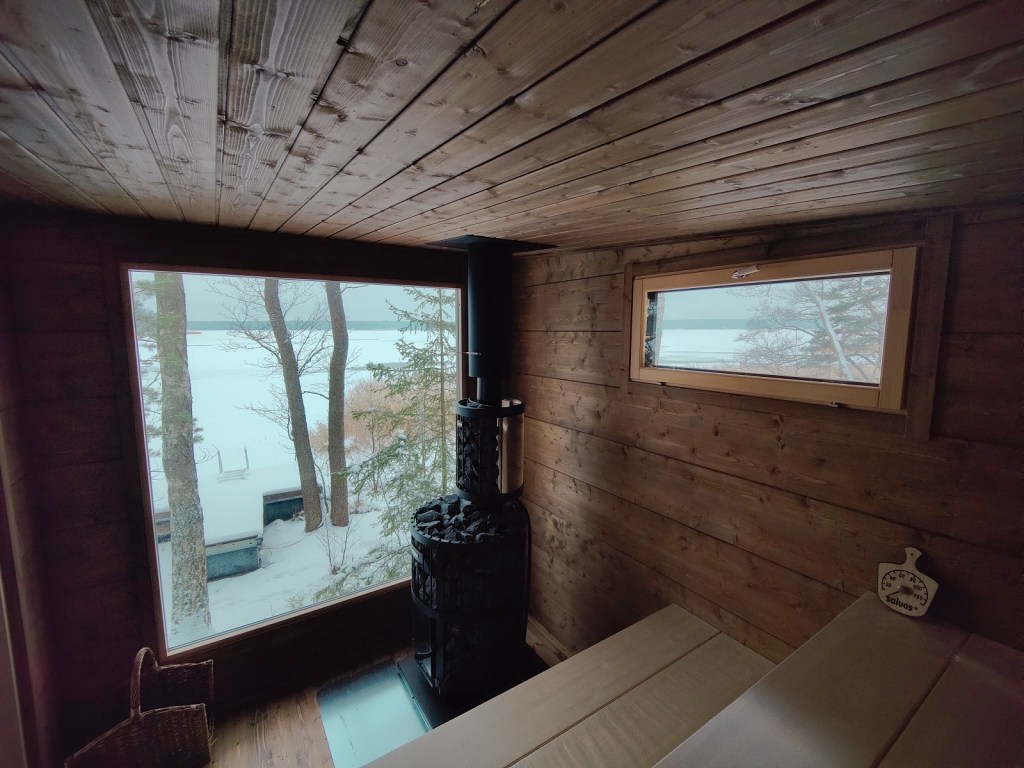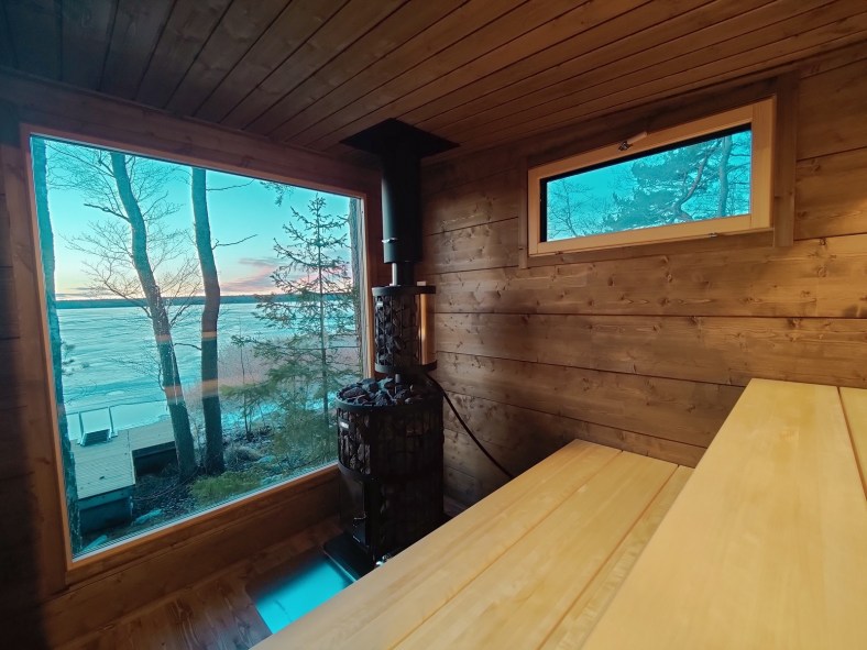 Illan jännittävin hetki – riittääkö nosturin ulottuvuus vai joudummeko kaatamaan puita, jotta auto pääsee lähemmäksi. Kovin monta senttiä ei ilmeisesti jäänyt pelivaraa, mutta hienosti Salvoksen kuljettaja homman hoiti.Sauna maastoutuu rinteeseen mainiosti. Näin ylhäältä katsoen vasemmalle eli siihen, missä nyt ovat nuo väliaikaisportaat, tulee saunatupa.Sauna perustustolppien päällä rannan suunnasta nähtynä. Tässä vaiheessa, kun ei vielä ole tupaa vieressä, rakennus on vähän yksinäisen näköinen. Käyttövalmiina se on tästä huolimatta.Sarjassamme asioita, jotka huomaa vasta sitten kun ne eivät toimi. Vanhan saunamme viemärit olivat jatkuva riesan aihe. Kesällä muuten vain tukossa ja talvipakkasilla lisäksi jäässä. Tämän uuden kanssa on vahva tunne, että viemäröinti toimii paremmin. Pesuvedet johdetaan maahan kaivettuun saunapalloon, josta ne sorapatjan läpi suodattuvat edelleen ympäröivään maastoon.Kiuas on mallia Harvia Legend hormiin integroidulla vesisäiliöllä. Kiuaskivien pesu ja latominen oli aika urakka. Reilu pakkanen toi asiaan vielä lisähaastetta. Tästä selvittiin ja kuvassa palavat ensimmäiset tulet. Ikkunan kahvaan solmittu musta johto on vedenlämmittimen letku. Kuumavesihana kiinnitetään lauteiden alle. Lauteiden asennus on tässä vaiheessa vielä pahasti kesken eli hana ei ole vielä paikoilaan. Kiuasta ei ole kuitenkaan hyvä lämmittää vesisäiliö tyhjänä. Letkun pää on siksi tuettu riittävän korkealle, jotta vedet saadaan pysymään säiliössä, kunnes hana on löytänyt paikkansa.Aikamoiset savut ja höyryt kiukaasta sekä kivistä ensimäisillä kerroilla lähtikin. Kaksi kertaa tehtiin tämä ”kuivaharjoitus” ja kolmannella kertaa olivat isoimmat käryt jo hälvenneet ja pääsimme kokeilemaan myös löylyjä. Tätä olemme seitsemän vuotta odottaneet – rantasauna, josta on näkymät merelle. Edessä oleva iso ikkuna on länteen ja päädyn ikkunasta näkee myös keskikesän auringonlaskut. Seinät ja katto on tehtaalla valmiiksi käsitelty Supi saunavahalla. Sävy on Salvoksen spesiaali, sekoitus Karhu ja Mesi -sävyjä. Lauteet ovat vaaleaa haapaa. Tarkoituksena on niiden osalta pärjätä pelkällä parafiinikäsittelyllä.