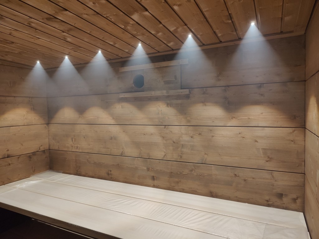 Lauteet sekä pukuhuoneen sisustus ovat tätä kirjoitettaessa viimeistelyvaiheessa. Niihin palataan tuonnempana. Alla olevien kuvien teksteissä on selostusta siitä, miten rakennus saapui kohteeseen ja miltä sauna näytti siinä vaiheessa, kun oli valmiina ensilöylyihin.