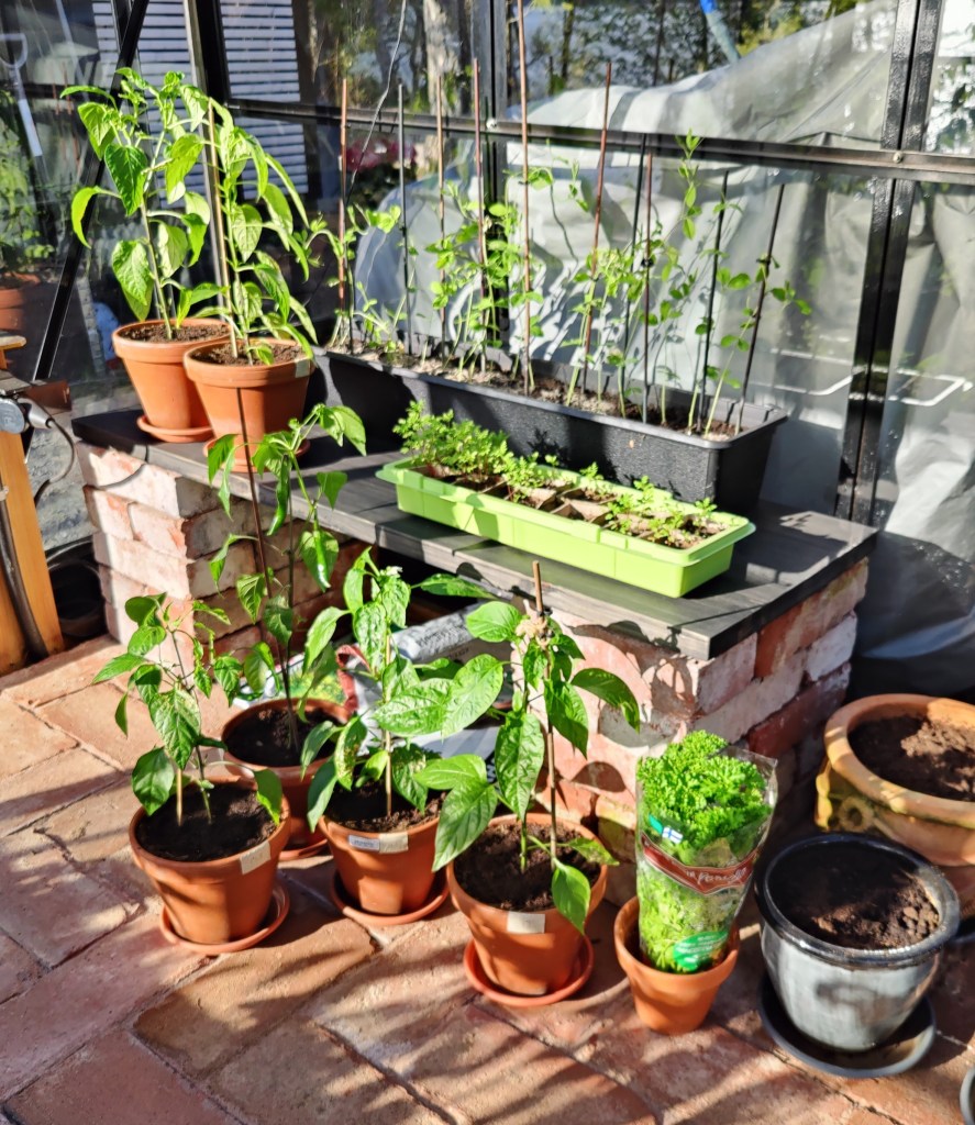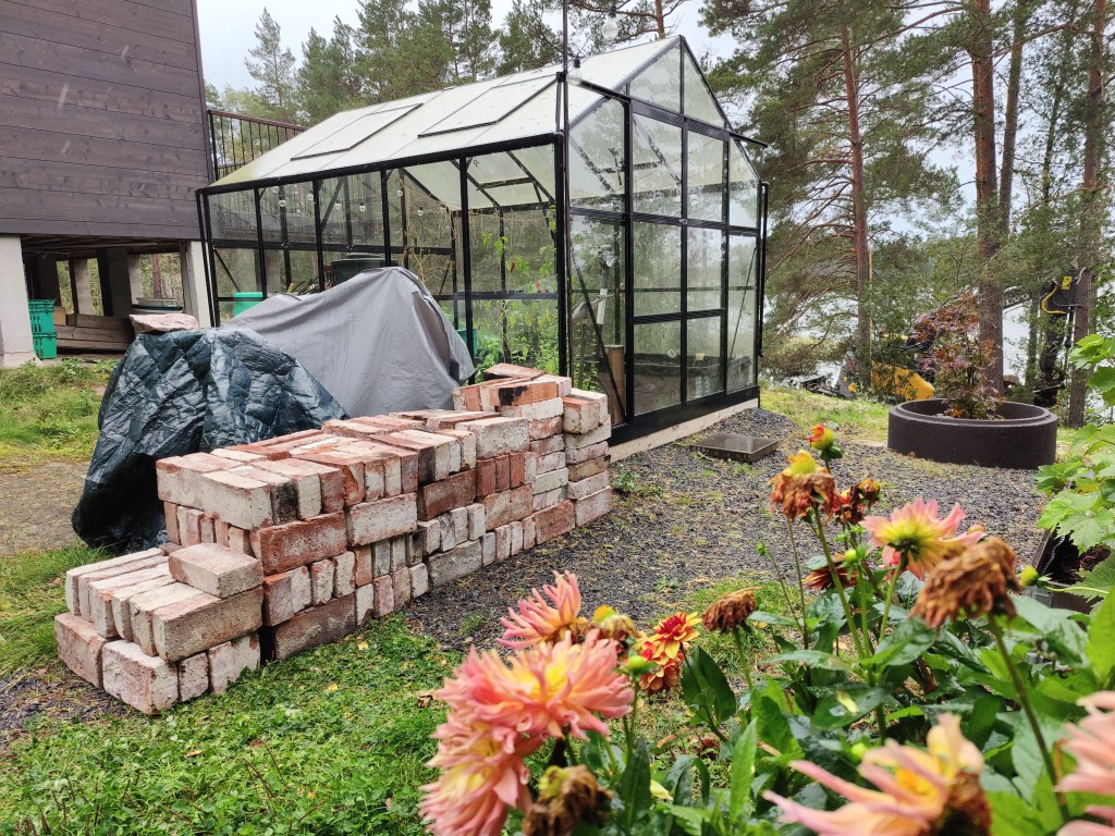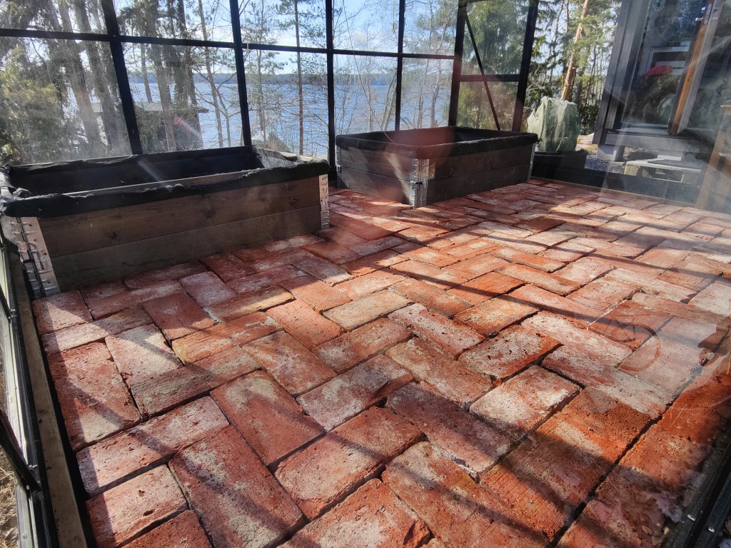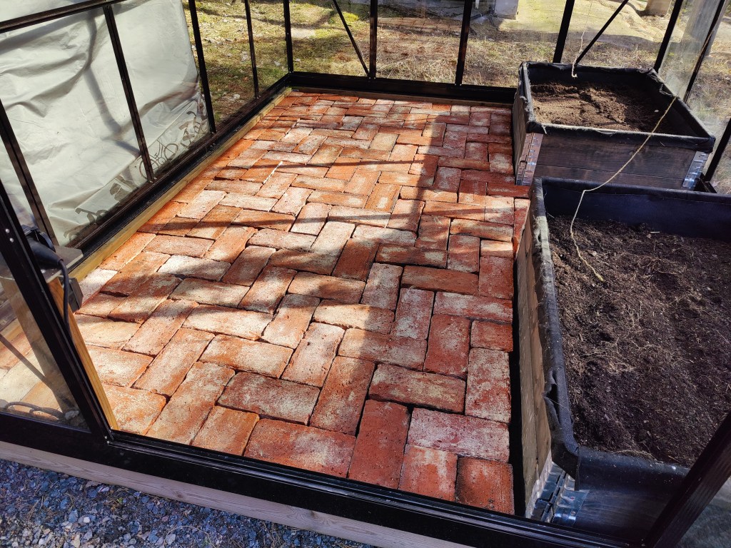 Uuden rantasaunan sivutuotteena saimme tarvikkeet kasvihuoneen lattian ehostamiseen. Pelastimme viime syksynä vanhan saunan purun yhteydessä niin monta ehjää hormitiiltä, kuin urakoitsijan kavinkoneen kauhan edestä ja alta vain ehdimme. Laskimme, että saisimme tehtyä näistä tiilistä kasvariin lattian ja niin myös lopulta kävi.