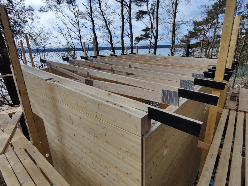 Kattoristikoita on yhdeksän kappaletta. Reunimmaiset ruuvattiin suoraan kiinni hirsirungon sisäpintaan. Muut kiinnitettiin kulmaraudoilla. Koolausväliksi määräytyi toimitukseen kuuluneiden Finnfoam -eristeiden mukaisesti 67cm. Mitathan eivät koskaan mene tasan, joten tarvittava säätö on tehty keskimmäisillä ristikoilla (niiden väli on n. 50 cm). Näihin väleihin tulevissa eristeissä oli siis enemmän leikkelytyötä.