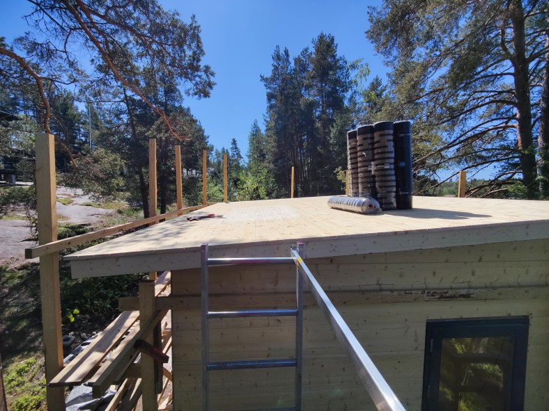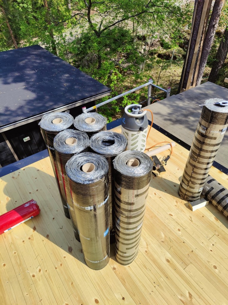 Kesä 2024 on ollut ilmojen osalta enimmäkseen rakentamista suosiva. Poikkeuksena tämä kaasupolttimella huovan asennuksen opettelu rutikuivalla katolla. Pieni kosteus ja alemmat lämpötilat eivät olisi olleet pahasta. Onneksi lähipiirissä oli tulitöiden asiantuntijoita, joten vahinkoriskit saatiin minimoitua.