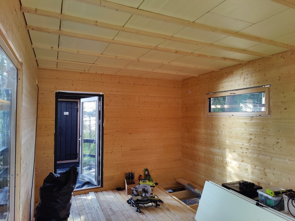 Tästä jatkettiin taas ilman apuvoimia. Seuraavina vuorossa olivat viimeiset isot ulkopuoliset työt: huopakate sekä seinien maalaus. Näiden jälkeen jatkoimme sisätöillä (eristeet, sisäkatto, lattia, sähköt, maalaukset, listat jne.) – palataan asiaan taas uusien postausten merkeissä.