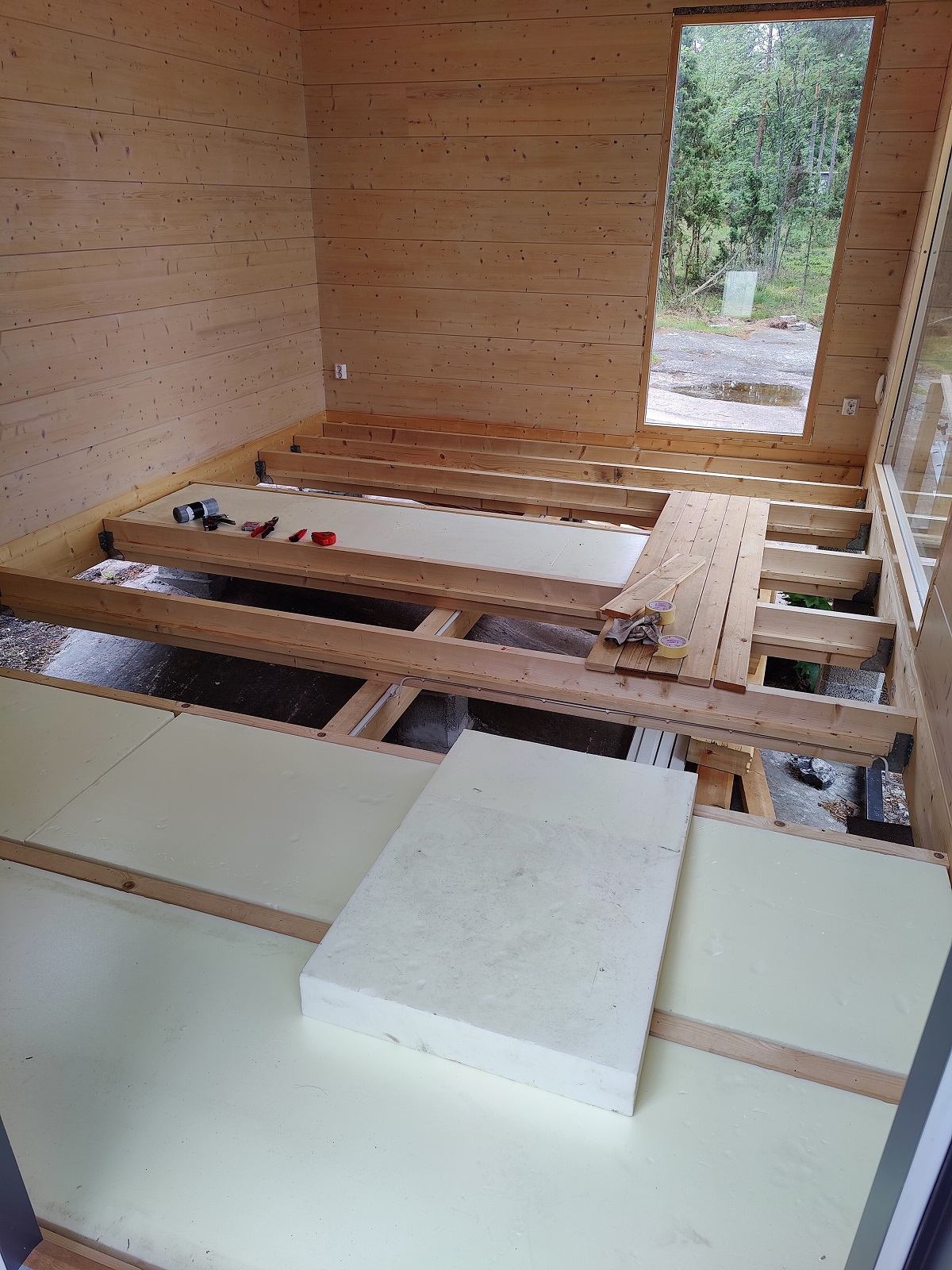 Alapohjan rakenne on peilikuva. Alla vasemanpuoleisessa kuvassa on meneillään lattianiskojen välissä olevien 100-millisten asennus ja oikealla ollaan jo loppusuoralla päälimmäisenä olevien 50 millisten kanssa.