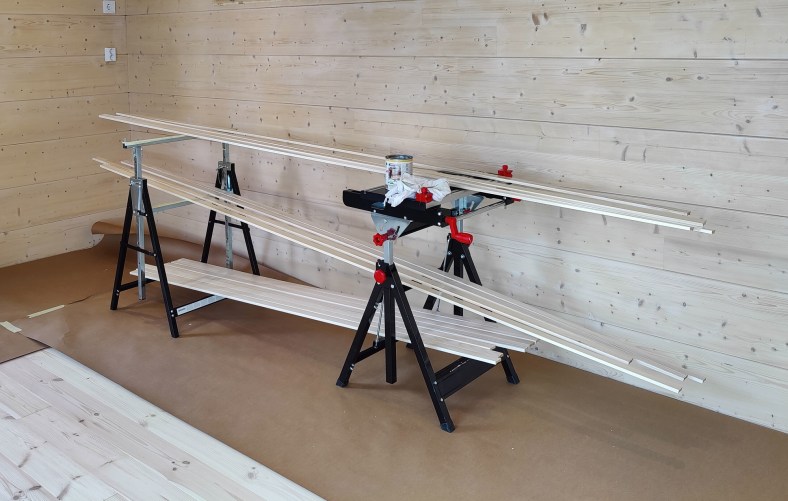 Telineitä varten oli hankittuna pari sataa metriä kakkosnelosta. Niistä ja aiemmista projekteista ylijääneistä laudoista saimme nikkaroitua ihan kelvolliset tellingit työtasoineen.