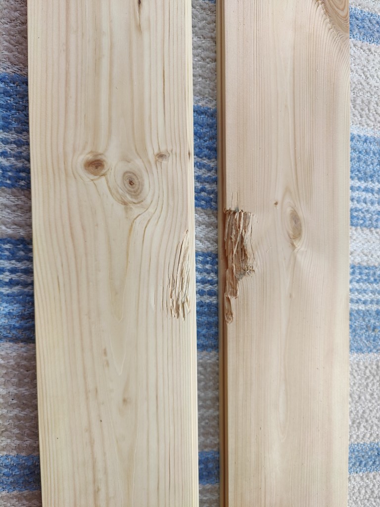 Tavaran saatavuus, hinta ja laatu ovat ilmiselvästi kehittyneet kuluttajalle epäsuotuisiin suuntiin. Toki saimme näistäkin tarvikkeista kohtuullisen hyvän lattian, mutta hukkaa tuli arvioitua enemmän ja aikaa piti käyttää miettimiseen enemmän kuin täysin priiman tavaran kanssa olisi ollut tilanne. Kuvan lautojen paraatipuolen ruhjeiden lisäksi haasteena oli useiden lautojen pahasti haljenneet päädyt. Reklamoimme asian K-Raudalle. He lupasivat lähettää palautteen valmistajalle ja lisäksi antoivat meille pienen hyvityksen aiheutuneesta vaivasta.