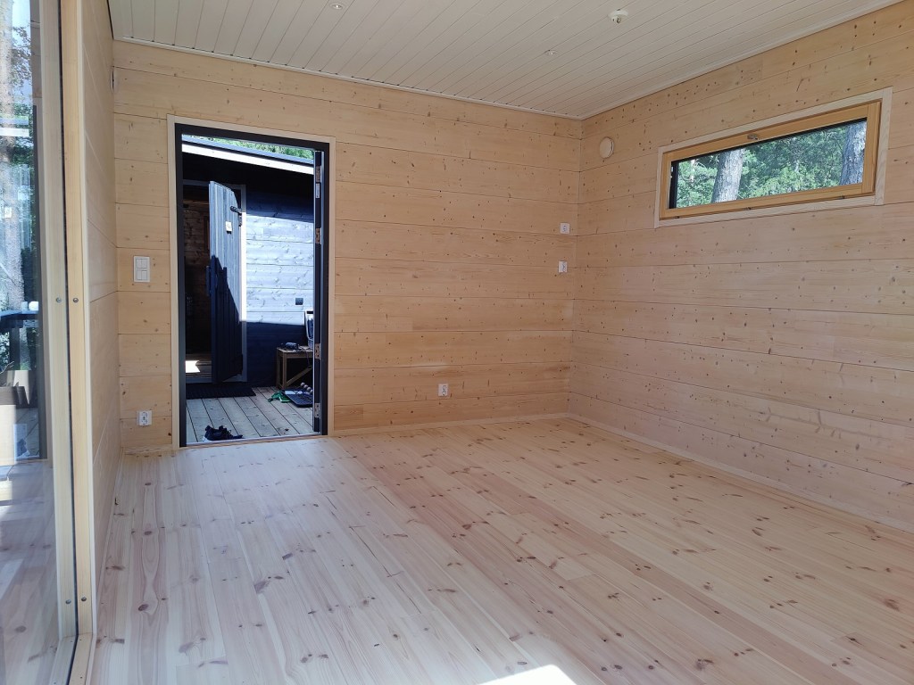 Saunakompleksimme julkisivu merelle. Kuten näkyy, pientä viimeistelyä vielä tarvitaan paitsi kaiteiden myös terassin katteen ja lisäportaiden osalta.Rantasauna ylärinteen puolelta (päämökin suunnalta) vähän aiemmin kesällä.Sisänäkymä, kun viimeinenkin lista oli paikallaan. Kuva vastakkaisesta suunnasta. Vasemmalla ovesta näkyy väliterassi ja ovi saunaan.Saunatuvan sisustus alkaa muotoutua.