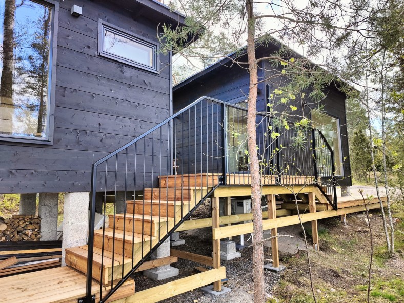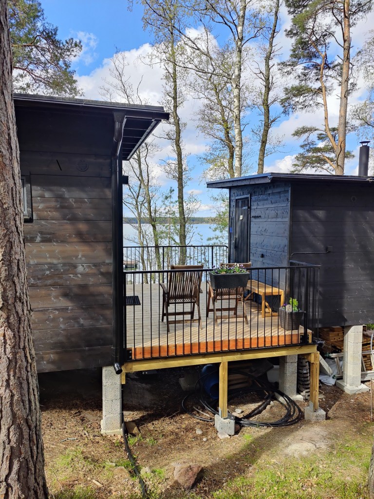 Kun kulkuväylä saunan edessä ja portaat olivat valmiina pystyimme viimein tilaamaan kaiteet. Olemme olleet tyytyväisiä huvilan terassien mustiin teräspinnakaiteisiin, joten oli luontevaa ottaa samanlaiset myös tänne rantaan. Toimittajaksi valikoitui tällä kertaa Artiikki Oy Tuusulasta. Vaikka toimittaja vaihtui, ovat kaiteet aika hyvin samannäköiset.