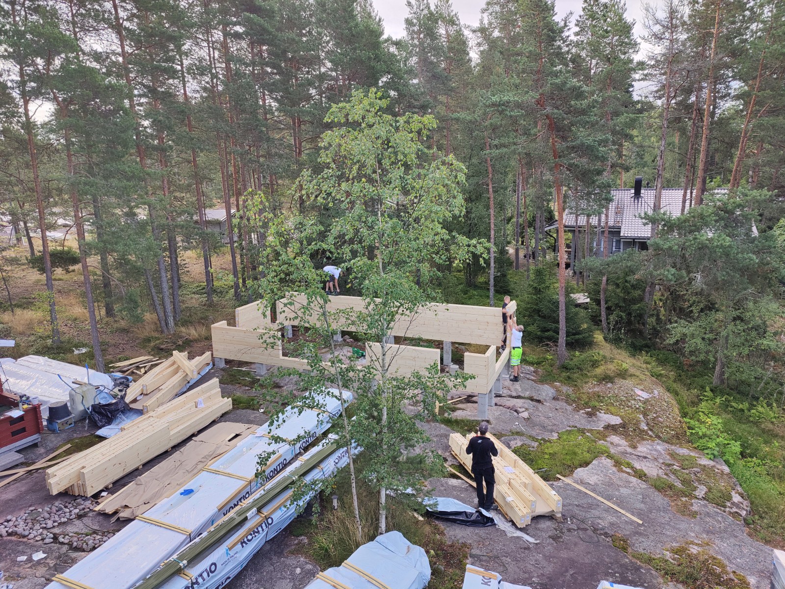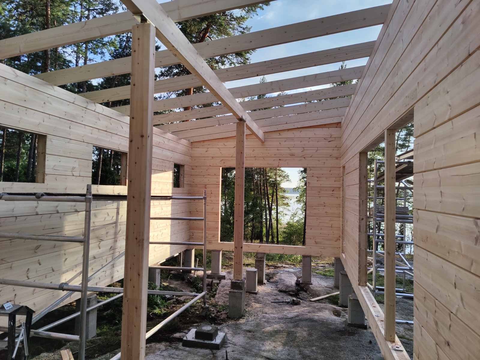 Hirsirunko valmiina katon ja ikkunoiden asennusta varten: