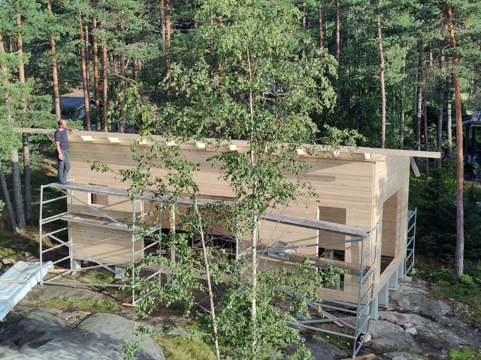 Tästä jatkettiin taas ilman apuvoimia. Seuraavina vuorossa olivat viimeiset isot ulkopuoliset työt: huopakate sekä seinien maalaus. Näiden jälkeen jatkoimme sisätöillä (eristeet, sisäkatto, lattia, sähköt, maalaukset, listat jne.) – palataan asiaan taas uusien postausten merkeissä.