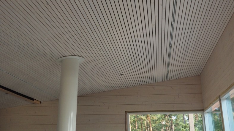 Katossa on palkkien alla poikkisuunnassa 25 milliset laudat. Näiden avulla saatiin kattopaneeleille tiiviimpi koolaus 40 sentin jaolla sekä mahdollisuus vetää sähköputkia vapaasti tarpeen mukaan myös ristiin palkkien ali.