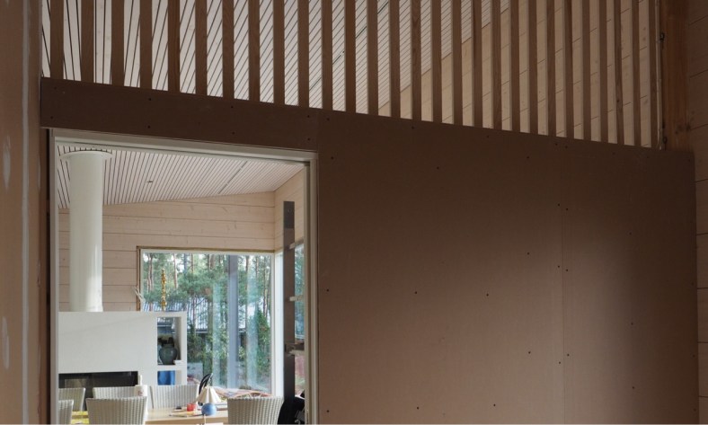 Huvilan hirsirungon mukana meille myytiin myös tarvikkeet sisäkattoihin. Jossain vaiheessa alkoi tuntua siltä, että tasainen ja vaalea levykatto on kyllä aivan tyylikäs, mutta myös lievästi tylsä. Isot ikkunapinnat yhdessä sileän katon kanssa suurehkossa avoimessa tilassa eivät myöskään ole akustisesti kovin hyvä vaihtoehto. Päätimme tehdä olohuone/ruokailutila/keittiö -alueille rimakaton. Jatka lukemista ”Rima korkealla”→