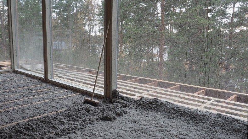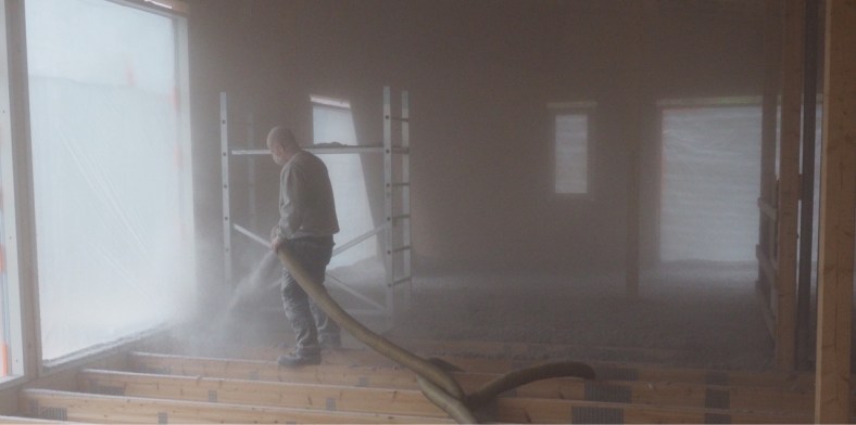 Ylä- ja alapohjan eristeiksi tulee puhallusvilla. Ennen puhaltajien tuloa pitää tietyt työt olla tehtynä. Toisaalta ei saa olla ylimääräisiä rakenteita asennettuna, jotta puhallustyö voidaan ylipäätään tehdä ja varsinkin että lopputulos olisi hyvä.
