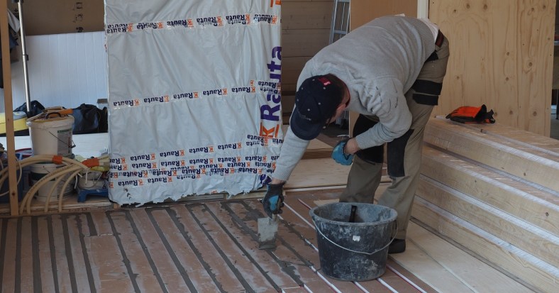 Edellisessä rakennelmassamme käytimme lattiaan Uulan pellavaöljymaalia. Tällä kertaa halusimme aineen, joka olisi helpompi työstää ja jolla saisimme kuultavan lopputuloksen. Valitsimme Osmo Colorin Öljyvahan (sävy 3041 Valkotammi). Jonkinlaiseksi yllätykseksi osoittautui, että valinta osui aivan nappiin. Seinien ja katon hankaluuksien jälkeen odotus oli, että eiköhän lattiankin osalta jotain ongelmia tulisi. Näin ei kuitenkaan käynyt. Osmo Color on riittoisaa, levittäminen sujuvaa ja lopputulos oikein mallikas. Tätä ainakin voimme lämpimästi suositella.