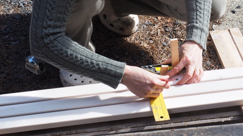 Rakennelmassa on kaksi ovea: toinen varastossa ja toinen huussissa. Vaikka tavaraa tuntuu ensisilmäyksellä olevan runsaasti tarjolla, juuri haluttujen mittojen ja laatujen kanssa saattaa törmätä ongelmiin. Näin kävi mm. ovien kanssa.