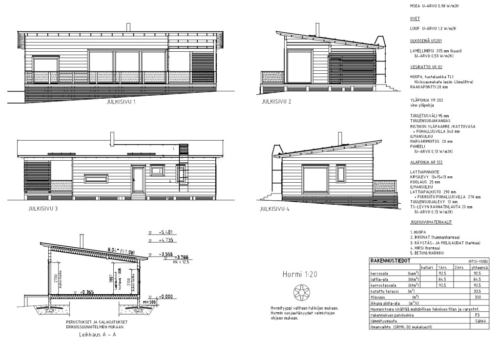 Tuossa kilpailutusartikkelissa ei ollut talon mittoja ja monet ovatkin oman hankkeensa vertailuja silmällä pitäen kysyneet niitä. Tässä tärkeimmät eli pohja-, leikkaus- ja julkisivukuvat mittoineen sekä pinta-alat ja tilavuudet.