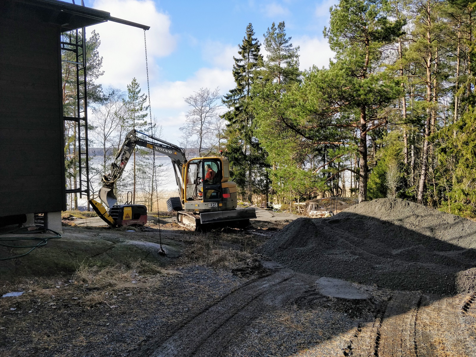 Kaivuutyöt teki sama paikallinen yrittäjä, joka on urakoinut kohteemme muutkin maatyöt. Asiat hoituvat kummasti helpommin, kun on tuttuja tekijöitä!