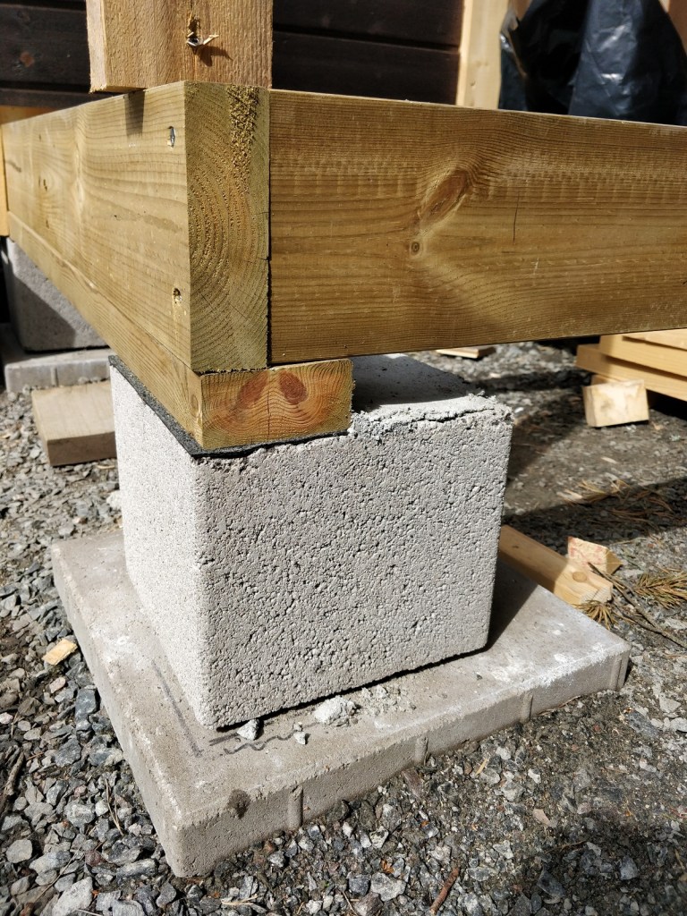 Perustamisvaihtoehtoja on monia. Koska kyseessä on kevyt rakennelma, päädyimme yksinkertaiseen ratkaisuun. Tasatulle murskeelle laitoimme alimmaiseksi 400 x 400 betoniset pihalaatat ja niiden päälle pilariharkot. Kaivinkonekuski oli tehnyt hyvää työtä alustan kanssa. Se oli tiiviiksi tärytetty ja vaaterissa. Laattojen ja harkkojen asettelu oli suht sujuvaa. Rakennelman saattaminen linjaan päärakennuksen kanssa oli tietysti tarkkuutta vaativa operaatio.