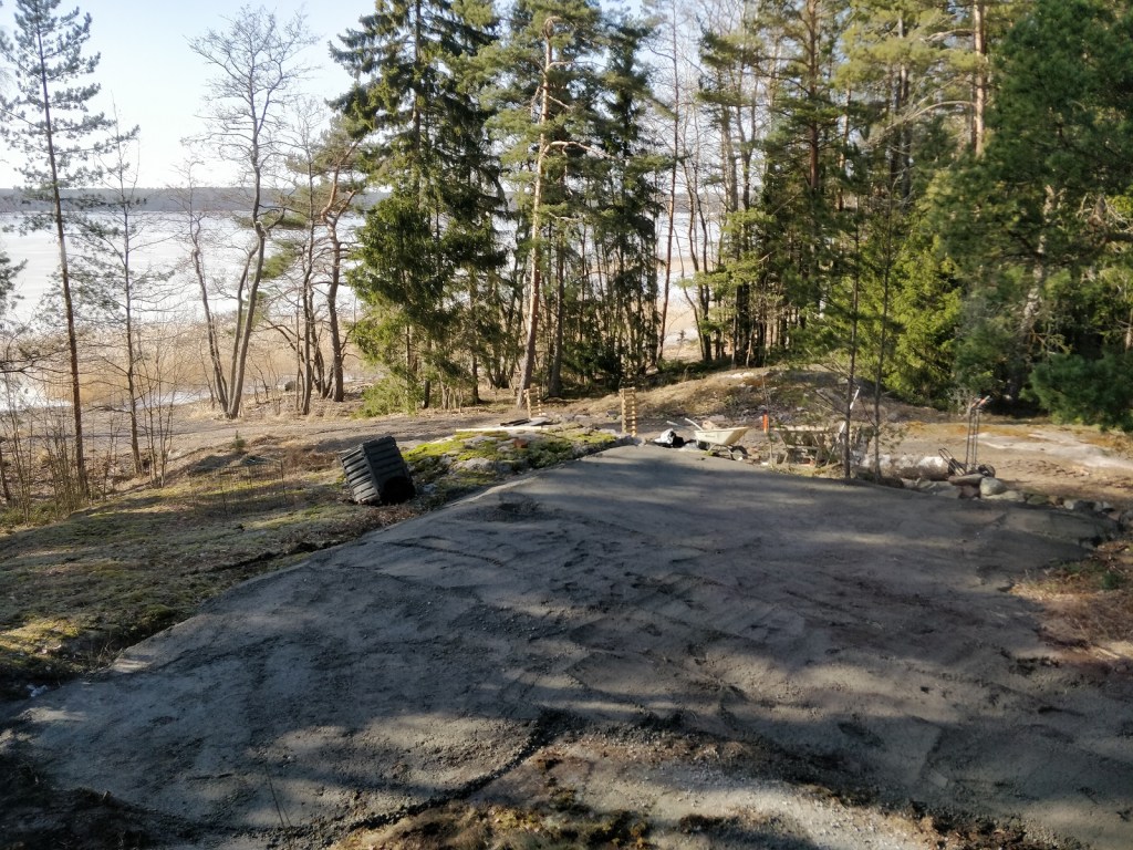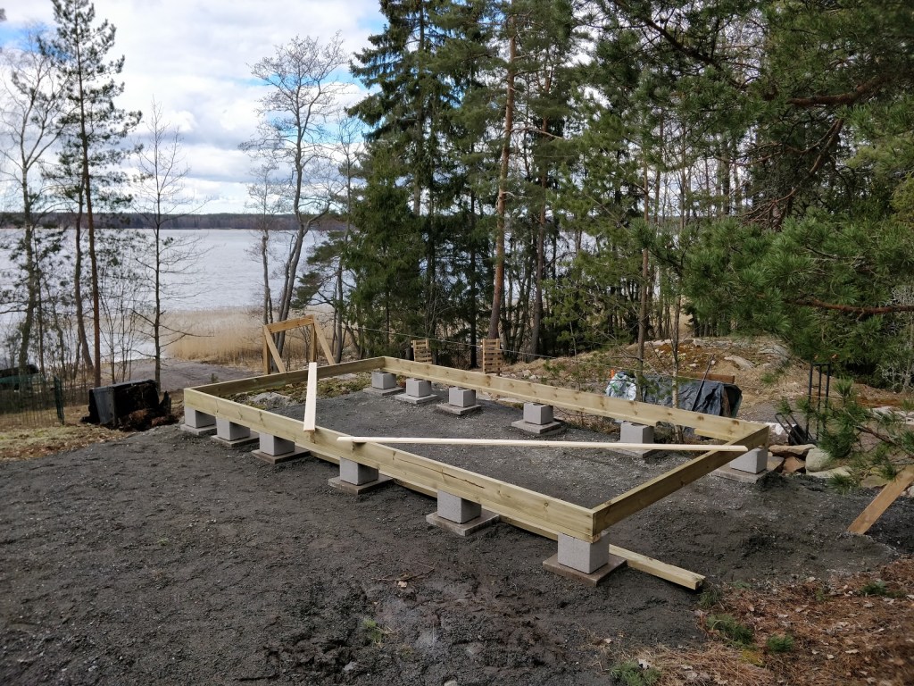 Aloitetaan tuvan osalta pohjalta eli perustuksista. Rantasaunan rakennuspaikka on haastava. Sauna on tasatulla sorapedillä ja tupa tulee kuoppaiselle ja jyrkälle kalliorinteelle. Väliin jäävä terassi toivottavasti vähän tasoittaa mahdollisia sorapatjan painumisia.