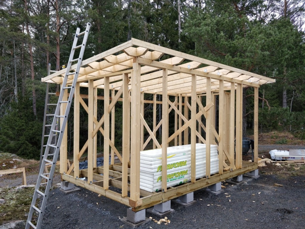 Rakennuksessa on pulpettikatto, kuten päärakennuksessakin. Kattokaltevuudeksi päätimme vähän loivemman eli n. neljä astetta. Kattotuolit ovat 48×148 palkkeja. Katteeksi tulee huopa, jonka alla on raakaponttilaudoitus. Tästä tarkemmin seuraavassa jaksossa, jossa lisäksi mukana ainakin seinien panelointia.