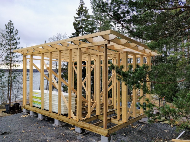 Rantasaunakompleksimme ensimmäinen osa saapui viime vuoden joulukuussa kuorma-auton lavalla tehtaalla valmiiksi koottuna pakettina. Vajaat kaksi tuntia ja sauna oli käyttövalmis. Kompleksin toinen osio eli saunatupa toimitettiin nyt huhtikuun lopussa rakennussarjana. Tämän osalta olisi hyvä suoritus, jos edes kahdessa kuukaudessa saisimme valmista aikaiseksi. Kolmas vaihe tulee olemaan rakennelmien väliin ja ympärille myöhemmin tulevat terassit.