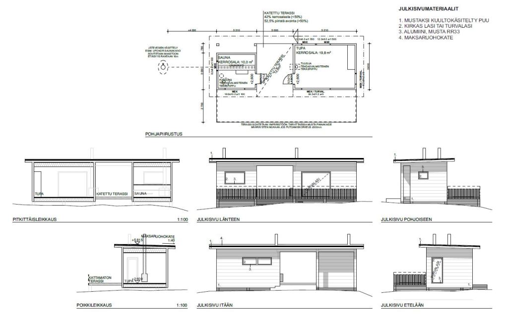 Virallisemmin sanottuna kyseessä on rakennelma. Tällä termillä Lupapisteessä lupaa haetaan. Kun suunnitellun rakennelman pinta-ala on alle 15 neliötä, siinä ei ole hormia, etäisyys rannasta on yli 40 metriä, naapurin rajaan on vähintään 4 metriä, etäisyys muista rakennelmista vähintään 8 metriä ja jos ko. rakennelmia on kiinteistöllä alle rakennusjärjestyksessä säädetyn maksimilukumäärän, anomus käsitellään kevyemmällä ilmoitusmenettelyllä. Mainitut ehdot tulivat täytettyä. Parin iteraatiokierroksen jälkeen saimme sitten positiivisen päätöksen ja projekti lähti käyntiin.