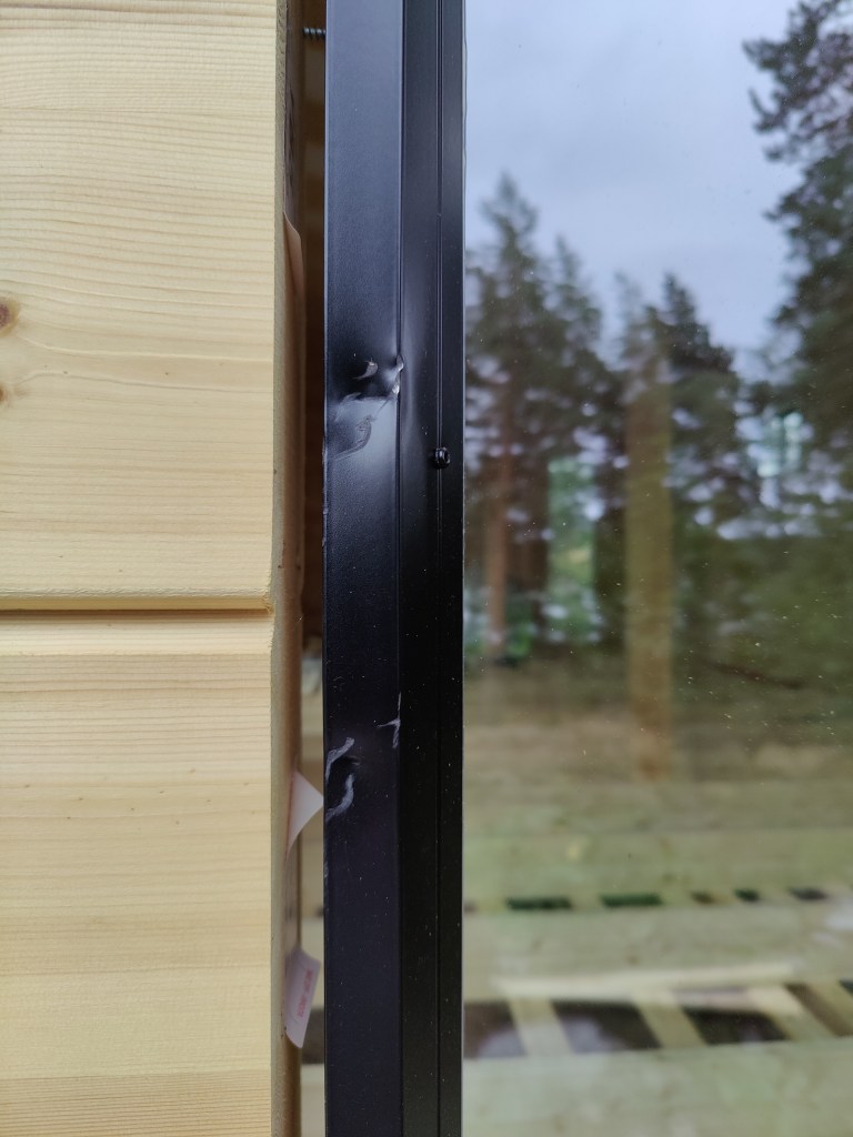 Toinen peltilistoihin liittyvä ongelma on ison ikkunan vasemman reunan kolhut. Se, ovatko kolhut tulleet kuljetuksen aikana vaiko vasta asennuksen yhteydessä, on epäselvää. Joka tapauksessa ikkunoiden valmistaja lupasi hoitaa asian kuntoon. Tätä kirjoitettaessa (28.11.) ja kahden muistutuksen jälkeen asia on edelleen hoitamatta. (Edit: Lista vaihdettu uuteen 2.12.2022)
