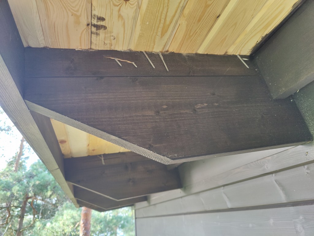 Raakapontti oli nyt asennettu alkuun väärinpäin: sileä puoli alaspäin eli höylätty viistepuoli ylöspäin. Jossain vaiheessa joku oli ilmeisesti huomannut virheen ja kesken kaiken oli laudat alettu asentaa oikein. Itse huomasin tämän ulkomaalauksen yhteydessä. Metsän puoleiset räystäänaluset olivat erilaiset kuin muut. Maalasin kuitenkin kaikki räystäät loppuun asti. Illalla tein reklamaation asiasta.