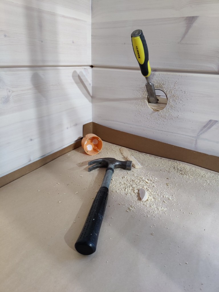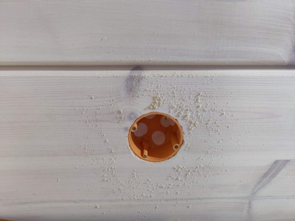 Näillä eväin homma onnistuu. Kriittisin vaihe on alkureiän lyönti piikillä ja vasaralla. Erityisesti ensimmäisen kanssa jännittää, että osuuko edes sinnepäin.Seuraavaksi reikäsaha porakoneeseen ja menoksi.Reikäsahalla saa kerrallaan poratua vain sen minkä terän ”kuppi” antaa myöten. Reiän tekeminen on porauksen ja talttauksen vuorottelua. Tällaiseen suht ohueen (135mm) hirteen reikä tuli kahdella varvilla.Reikien teon yhteydessä tuli esiin, että rakennuksen hirret ovat todellakin painumatonta tavaraa. Keskimmäinen hirsilaminaatti on pystysuorassa ja se vaati myös talttaussunnaan kääntämistä 90 astetta.Löytyihän se hirteen tehtaalla porattu reikä. Ja juuri sieltä mistä pitikin!Vähän imurointia ja rasia on valmis johdotuksia varten. Yksi käytännön detalji on, että itse rasiat ovat hirsiseinässä erilaisia kuin runkorakenteisissa seinissä.Sähkötyöt jatkuvat tästä eteenpäin perinteisemmin eli johdotukset sekä kalusteet asennetaan väliseiniin ja kattoihin. Sen jälkeen päästään seinien levytyksiin ja katon panelointiin. Niistä lisää seuraavassa jaksossa.