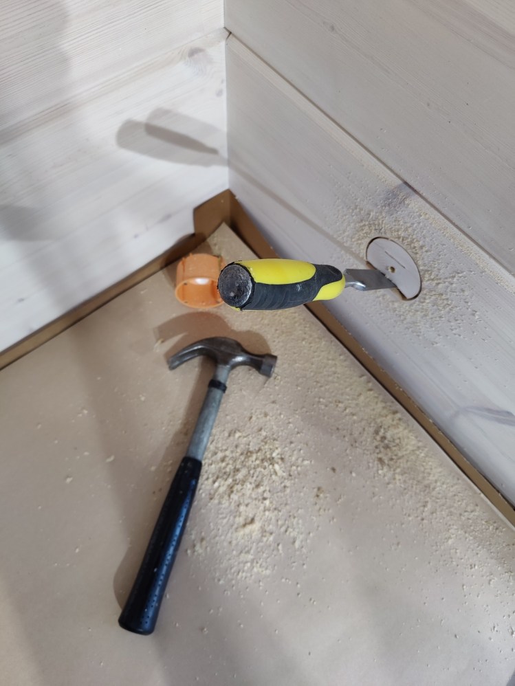 Kuvan ylemmät ruuvit (8X200 milliset) tulivat ikkunapieliin ja hirsikehikon nurkkiin. Pidempiä 8×240-millisiä ruuvattiin muutama joka hirteen pystysuoraan. Ruuvauskärkenä oli harrastelijalle vähän epätyypillinen TX40. Mittakaavaa tuomassa on kuvassa keskellä tavallinen 5×90 -millinen ruuvi. Voisi kuvitella, että kehikko pysyy näillä eväin kasassa.Vanha ruuvinvääntimeni oli lujilla ruuvien kanssa. Hyvin kone kesti, vaikka välillä vähän valittikin.