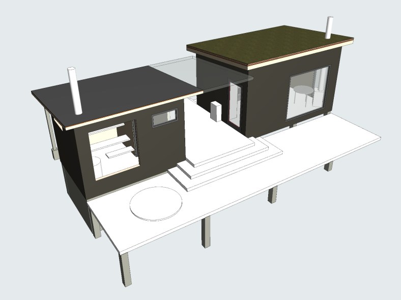 Yllä olevassa kuvassa talousrakennuksen pohja sekä julkisivut. Rakennelman pinta-ala on n. 40 neliötä. Päädyn isosta ikkunasta aukeaa näkymä merelle länteen. Takaseinä pienine yläikkunoineen on naapurin suuntaan. Oven eteen on suunnitteilla terassi – kuvan portaat ovat vain mallina.