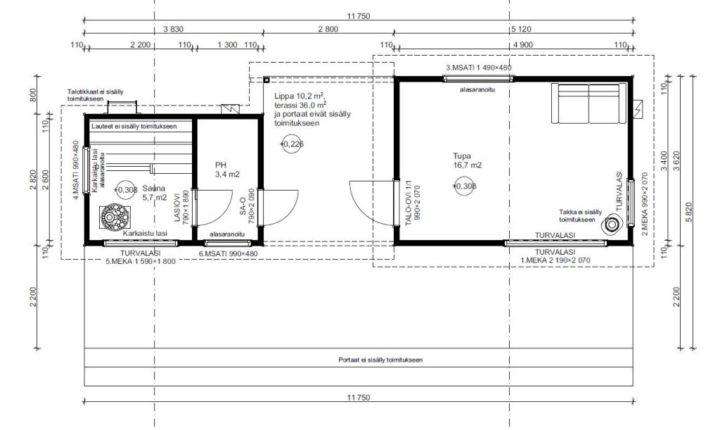 Rakennelman saunaosuus toimitetaan aikataulun mukaan joulukuun alussa valmiina pakettina. Rakennelman toisessa päässä oleva saunatupa tulee kohteeseen osina ja tilaaja eli me vastaamme pystytyksestä. Tässä tuli vastaan Salvoksen rajoitteet. Haluamillamme mitoilla he eivät pysty toimittamaan tehtaalla valmiiksi tehtyä rakennusta. Vaihtoehdoksi jäi osatoimitus. Saunatuvan osalta meillä ei toisaalta ole kiire. Sen toimitus on ajoitettu keväälle, jolloin rakentaminen on talvea huomattavasti mukavampaa.