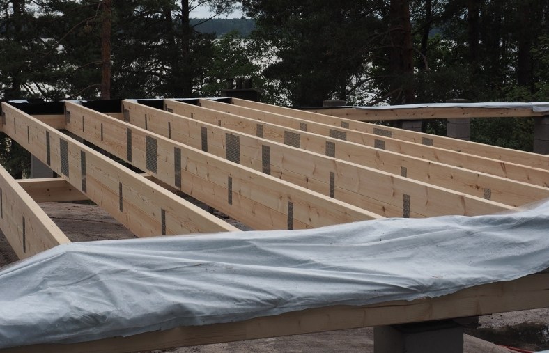 Meillä on tässäkin rakennuksessa huopakatto. Tyypillisesti huovan alla on yhtenäinen laudoitus, raakapontti. Ko. laudan erikoisuus on, että sillä saadaan toiselle puolelle täysin tasainen pinta ja toinen puoli on höylätty ja siinä on siistit viisteet. Viisteet jäävät näkyviin räystäiden alle tai mahdollisesti avoterassin kohdalla.