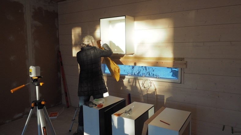 Ennen väliseinien rakentamista tila oli varsin avara.Oleskelutilan ja makuuhuoneen väliseen seinään tulee minikeittiö. Molemmin puolin on kulkuaukot ilman ovia. Väliseinä levytettynä odottamassa keittiökaappeja. Tässä vaiheessa rullasimme lattian suojapaperit sivuun aina kun tila oli tyhjillään. Lattiamaali kuivui tosi hitaasti etenkin paklausten kohdilta ja riskinä ilmiselvästi oli, että paperi tarttuisi kiinni. Joulun ja uudenvuoden ajan pidimme projektissa kolmisen viikkoa taukoa ja sittemmin paperit ovat saaneet olla lattialla jatkuvasti. Tätä kirjoitettaessa (maaliskuun puolivälissä) emme vieläkään ole nähneet miltä lattia näyttää nyt, kun alkaa olla jo suht valmistakin. Jännitystä siis riittää. Sama seinä kuin yllä, mutta makuutilan puolelta katsottuna. Tasoitustyöt ovat hyvässä vauhdissa.Sähkötyöt määrittivät marssijärjestystä. Kaapistojen rungot piti asentaa mahdollisimman pikaisesti, jotta sähkäri pystyi työskentelemään järkevästi. Kaappien valmistaja selvinnee asiaan vihkiytyneille pelkästä kuvasta. Muillekin tiedoksi: Ikea. Tällä kertaa mietimme pitkään ja perusteellisesti eri vaihtoehtoja. Vaikka Ikean järjestelmä on suhteellisen kankea, näppärät keittiömyyjät saivat toteutettua kaikki ne erikoisuudet, joita halusimme. Pari käytännön hankaluutta kuitenkin jäi jäljelle. Ensinnä tämän pienehkön kokonaisuuden toimitus tapahtui n. kymmenessä erässä. Osa komponenteista tuli kohteeseen joko postin tai jonkun muun kuriirin kyydillä eri kerroilla, osa tavaroista tuli kaupunkiosoitteeseemme ja joitain osia haimme Ikean myymälöistä. Kaikki palikat tulivat lopulta kyllä perille. Toinen hankaluus liittyi kaapistojen kasaamiseen. Edelliskertojen perusteella oli toki tiedossa, että ruuvirumbaa riitti. Vähän pääsi yllättämään se, että ohjeet on tehty puhdasta perussettiä varten. Meillä on erikoisuuksia kuten ylimääräisiä peitelevyjä ja esim. integroitu jääkaappi. Näiden kanssa oli oma jumppansa. Oma lukunsa ovat kaapistoihin asennetut ledivalot. Ne olisi ollut hyvä asentaa jo siinä vaiheessa, kun kappeja kasattiin. Kyllähän ne jälkeenpäinkin paikoilleen saatiin, mutta homma olisi ollut helpompaa aikaisemmin ja lopputulos siistimpi. Se, millaiset kaapistoista tuli, selviää myöhemmissä kirjoituksissa. Pysykää linjoilla. 🙂Katon panelointiin saimme apuvoimia. Reikien teko spottivaloille ja kattorasioille on aikaa vievä ja tarkkuutta vaativa operaatio. Paneeli on Cent Dyyni -merkkistä valkolakattua mäntyä. Paneelin profiili näkyy selkeämmin seuraavassa kuvassa.Onnekas sattuma oli, että paneelia oli saatavilla mitassa 420cm. Sisäkaton leveys on 416cm. Hukkaa tuli siis todella vähän eli prosentin verran. Lisäksi kaikki laudat ovat katossa täysmittaisina ilman yhtäkään jatkosta! Tavaran laatukin oli hyvä eli kaikki laudat olivat käyttökelpoisia. Käytännössä pitää kuitenkin aina tilata vähän yli tarpeen, joten meillä oli mahdollisuus valita hyvistä laudoista jopa ne parhaat. Ylijääneelle tavaralle emme vielä ole keksineet käyttöä. Takassa kyllä palaisivat iloisesti, kuten kuvassa näkyvillä pienillä hukkapaloilla tuli jo testattua.Oleskelutilan katto paneloituna ja spotit asennettuina.Rakennelman kiinteät lämmityslaitteet ovat edellisessä kuvassa näkyvä ilmalämpöpumppu ja tämä takka. ILP on merkiltään Mitsubishi eli saman valmistajan tuote, joka on palvelllut jo viisi vuotta päärakennuksessa. Merkkiuskollisuuden etuna on laitteiden etäohjaus saman sovelluksen kautta. Takka on Contura -merkkinen ja ensimmäisten kokeilujen perusteella varsin tehokas. Toki tällaiset kamiinatyyppiset ratkaisut lämmittävät vain niin kauan kuin tuli palaa. Toisaalta pieneen, enemmän tai vähemmän tilapäiskäyttöön tarkoitettuun rakennukseen ei isoa ja raskasta varaavaa uunia välttämättä edes kaipaa.Rakennuksen ainoa sisäovi on oleskelutilan ja makuualkovin välissä. Malliksi tähän valikoitui Swedoorin seinän sisään menevä liukuovi. Ko. ovi vaatii kuvassa näkyvän valmistajan oman rungon. Liukuovi on kätevä käyttää, mutta suunnitteluvaiheessa on hyvä ottaa huomioon ovimallin asettamat rajoitukset esim. pistorasioille. Ovirunko on myös sen verran heppoista lautaa (rimaa) että siihen ei juuri muuta voi kiinnittää kuin kipsilevyn ja senkin lyhyillä ruuveilla. Tämä aiheutti meille hiukan päänvaivaa, kun mietimme kuvan alkoviin tulevien kerrossänkyjen rakenteita. Tästäkin lisää myöhemmin.Loppuun ulkokuva työmaasta maaliskuun illassa. Jatkoprojekteina ovat luontevasti portaat ja terassi oven eteen. Tavoite on päästä aloittamaan niitä, kunhan lumet ovat sulaneet ja ulkolämpötilat taas selvästi plussalla.