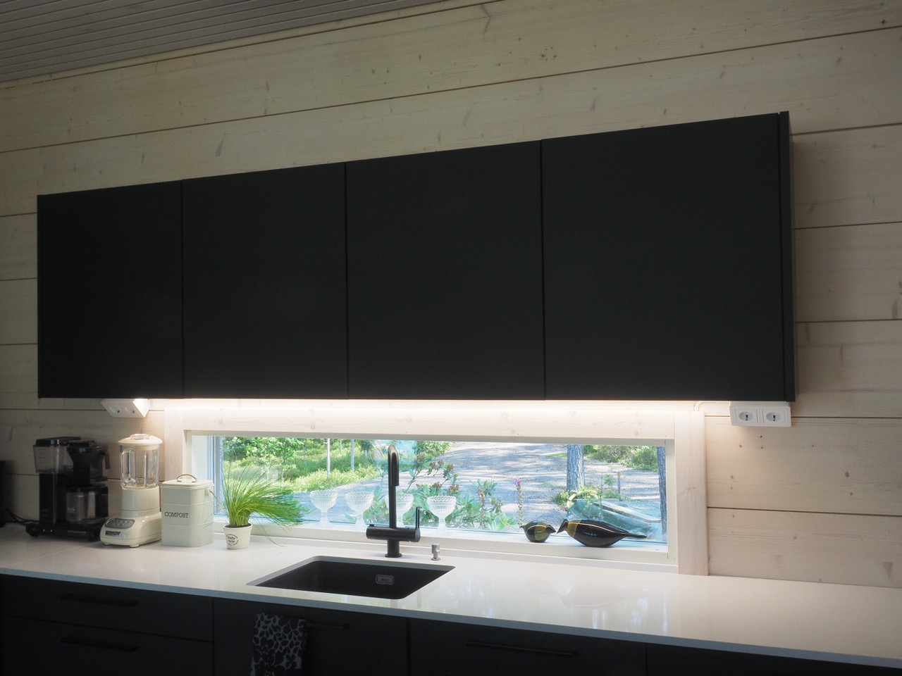 Siitä onkin jo vierähtänyt aika tovi, kun viimeksi kirjoitin keittiöstämme. Viikko sitten sähköurakoitsijamme kytki välitilan valot sekä pistorasiat. Johdot kulkevat osin ikkunan karmien sisällä, joten listoitukset ovat joutuneet odottamaan. Nyt saatiin nekin paikoilleen ja keittiön ilme alkaa olla koko lailla viimeistelty. Alla kuvia lopputulemasta.