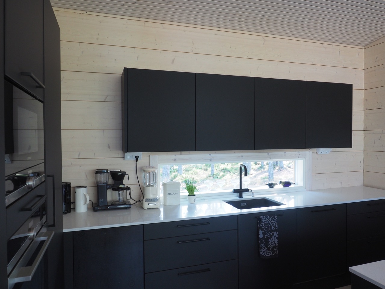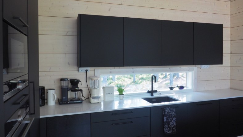 Aivan kaikkea ei onnistuttu tiloihin mahduttamaan, mm. haave aamiaiskaapista jäi toteutumatta. Lopputulokseen ollaan kuitenkin oikein tyytyväisiä. Hyvä näin koska tämä ”mökkikeittiömme” on kaupunkiasuntomme vastaavaa isompi, monipuolisempi, paremmin varusteltu ja näin ollen tietysti myös kalliimpi. Logiikka taustalla on – kuten meidät tuntevat hyvin tietävät – että vakiasuntoamme olemme vaihtaneet tasaisen epätasaiseen tahtiin, mutta tämä huvila on tehty pysyväksi. 🙂